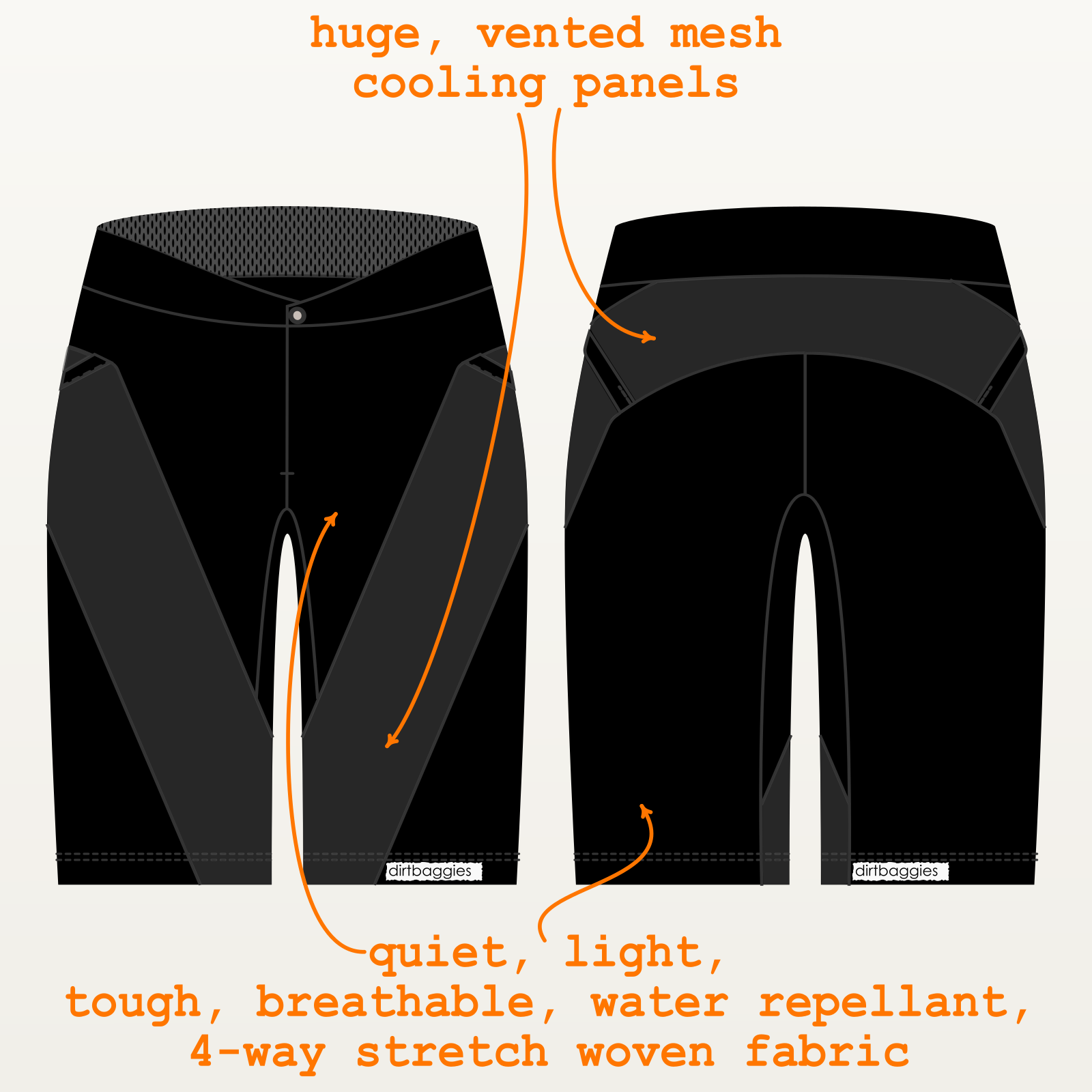 BREEZE has huge, vented mesh cooling panels over the quads and lower back. High abrasion regions are made of quiet, light, tough, breathable, water repellent 4-way stretch woven fabric.